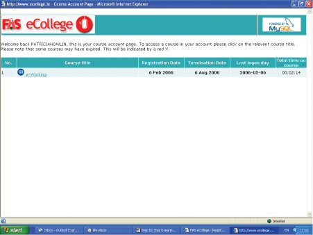 3. The Course Account page gives you details of your registration, course duration and the total amount of time you have spent learning so far. Click the course title you have chosen to commence the course.